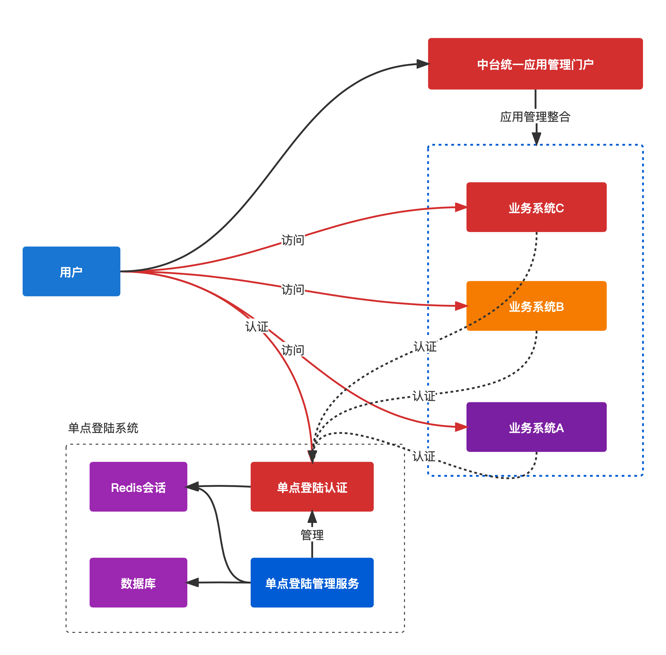 單點登陸解決方案架構,集成應用管理門戶,集成多個業務系統管理,架構如下: